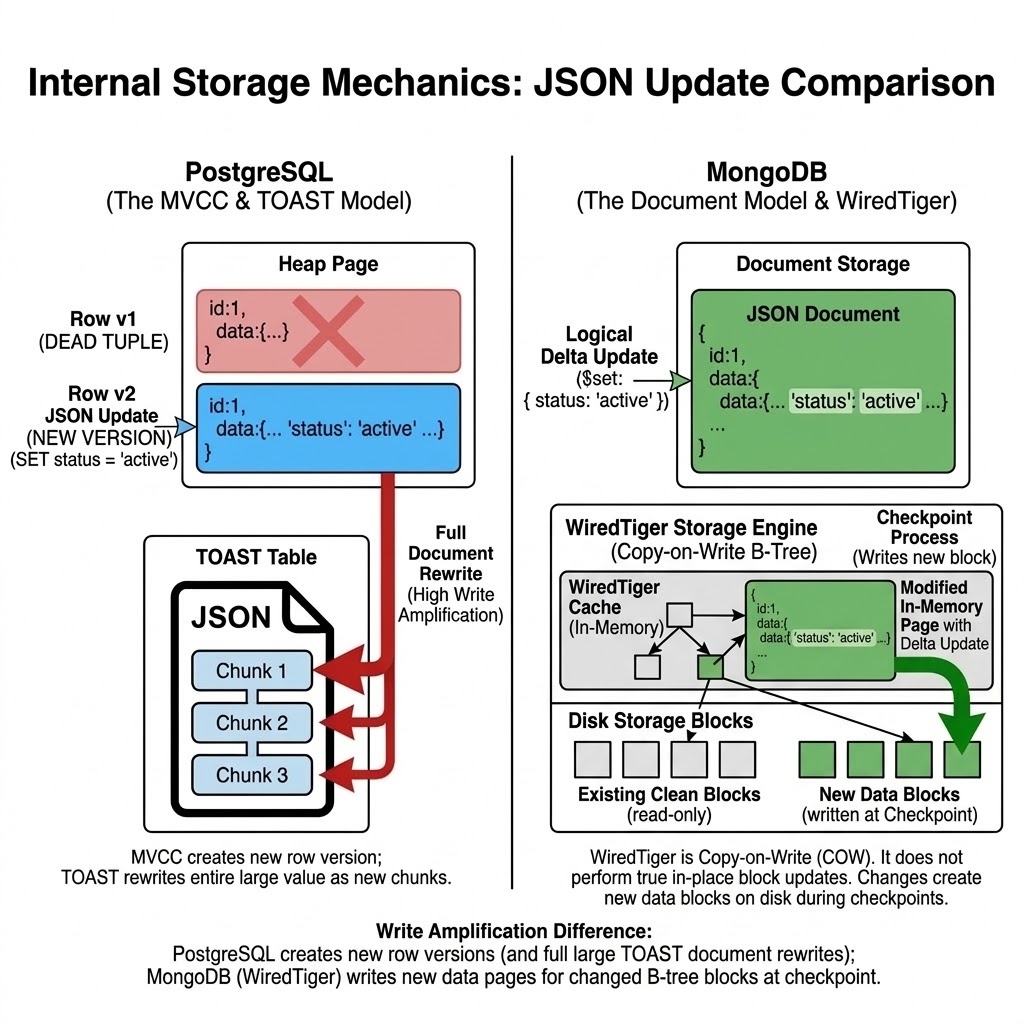 MongoDB's WiredTiger storage engine also uses MVCC internally, but it employs a copy-on-write B-Tree model rather than PostgreSQL's heap-based tuple versioning. When you update a document, WiredTiger caches the modification in memory and appends it to a Write-Ahead Log. During its periodic checkpoint process, it writes modified pages to new block locations on disk and eventually frees the old space.